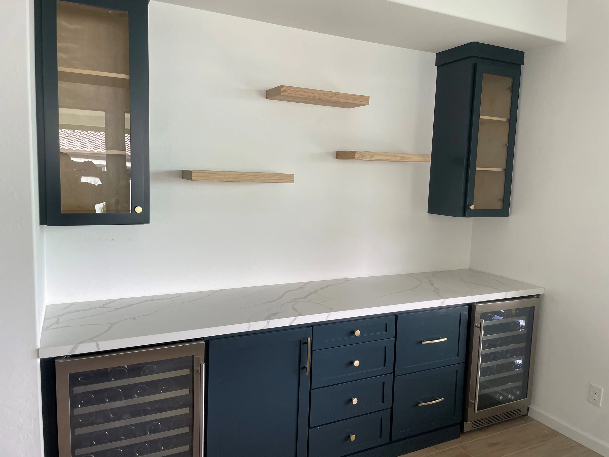 Custom Finish with natural floating shelves all completed and finished on-site by All Valley Finishing